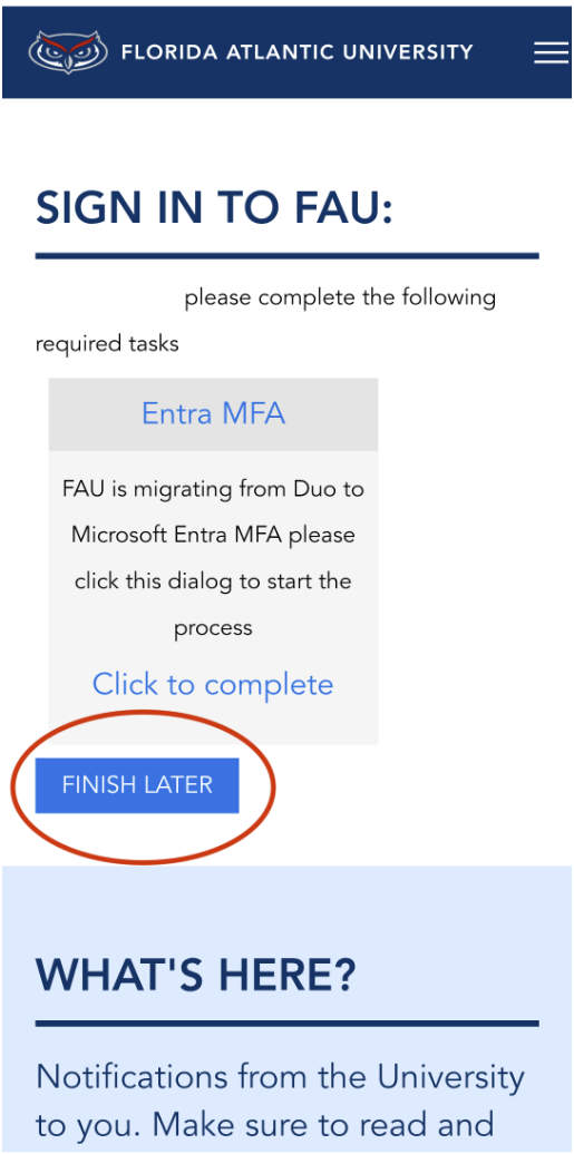 If prompted to enroll in Entra MFA, Click Finish Later when asked to configure Entra MFA as you are already completing this task.