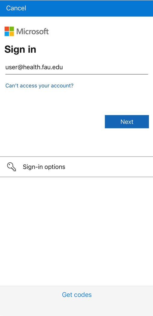 Enter your NetID followed by @fau.edu. Example: testaccount22@fau.edu, testaccount23@health.fau.edu for users with HIPAA email accounts