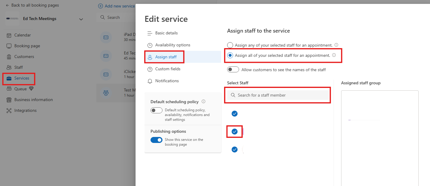 - Under “Assign Staff” add new staff members and ensure “Assign all of your selected staff for an appointment”