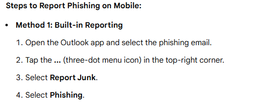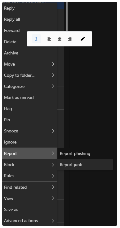 If you’re using Outlook on the web, please right click on the email and select Report, then select Report Phishing.